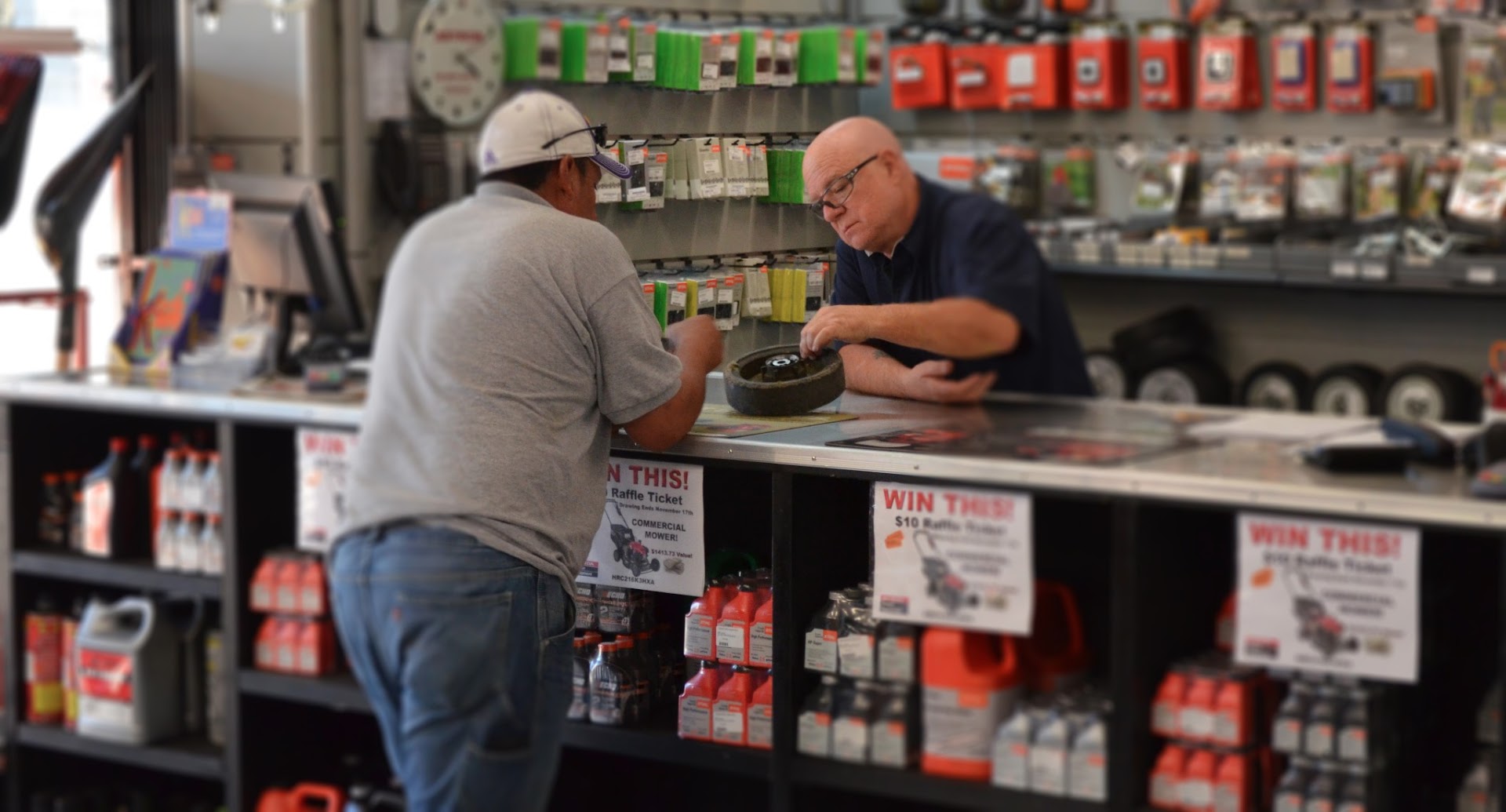 I have no complaints on the 2 front desk guys they have always been good to me. It's that grumpy old man why this guys lost my buisness. He tried to charge me 2 hours to replace a part that would only take 5 minutes that's how long it took me to replace the throttle . And on top of that when I said I didnt want the repairs done they still charged me to take a part the chainsaw. I told the old guy bring me the chainsaw nd if it's taken a part I will not have no problem paying but the chainsaw had not even been touched nd still charged me 50 for he said eyeballing the chainsaw. I used to spend thousands at this place it sucks that it takes one guys to ruin everything.